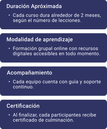 Más que un curso, es un proceso guiado donde el equipo avanza junto, aprende en comunidad y aplica lo aprendido en su contexto real.